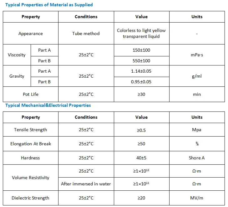 4 | Features | Good processability, both room temperature and heat-curable. Good resistance to cracking, good water, and moisture resistance. Good flowability after mixing, bright appearance of cured material. Low shrinkage and insulating properties Excellent performance. |
