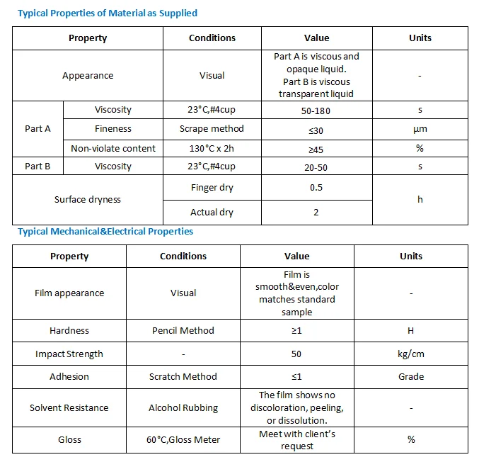 4 | Features | Low VOC, low odor. Fast drying, high hardness, good adhesion, wear resistance, excellent mechanical strength. Excellent weather resistance, color retention, and film fullness. |