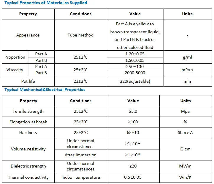 4 | Features | The resin has good process properties and can be cured at room temperature and heat. It has very good fluidity after mixing. The cured object has a bright appearance, good crack resistance, good waterproof and moisture resistance, low shrinkage and excellent insulation performance. |